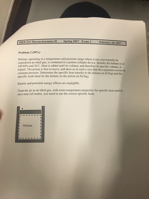 The pressure inside the cylinder is held constant at 300 kPa during the process, and a heat loss of 60 kJ occurs. 5-13. A piston-cylinder device contains helium gas initially at 150 kPa, 20°C, and 0.5 m3. The helium is ... Document Retrieval