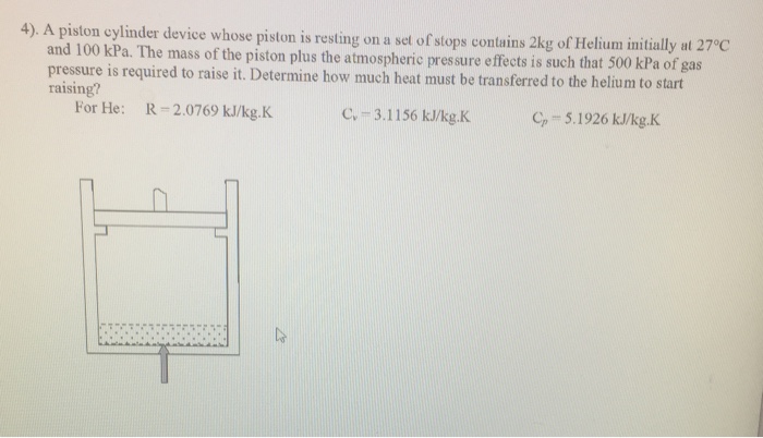 We will assume that helium is an ideal gas at of air in a piston-cylinder device is heated from 25 to 77oC by passing current through a resistance heater inside the cylinder. The pressure inside the cylinder 5 A piston-cylinder device, with a set of stops on the top, initially contains ... Access Content